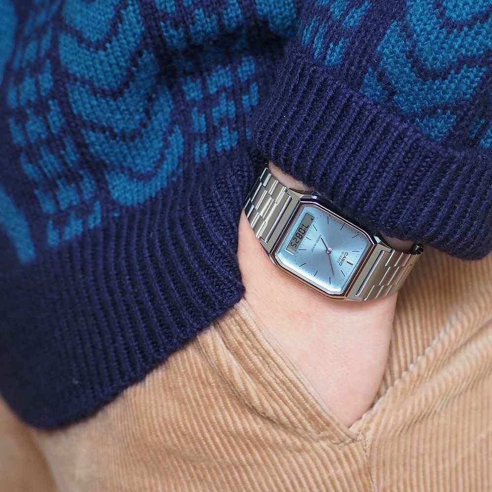 Casio AQ-230A-2A1MQYDF je retro unisex sat koji spaja analogni i digitalni prikaz u jednom klasičnom dizajnu. Njegovo pravougaono kućište i čelična narukvica daju mu vintage izgled, dok plavi brojčanik sa jasno vidljivim markerima unosi dozu modernosti.
