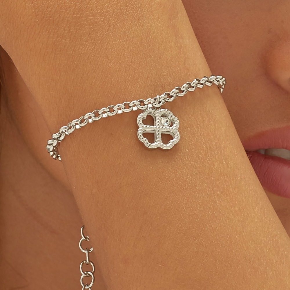 Bela narukvica sa prozirnim kristalom. Dizajnirana za modernu ženu koja voli jednostavnost i luksuz u svakodnevnom stilu.