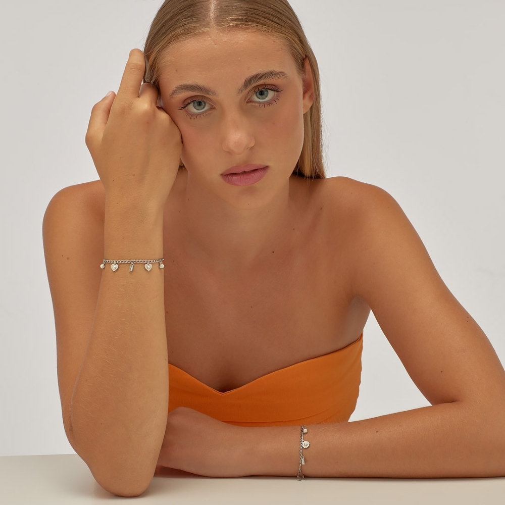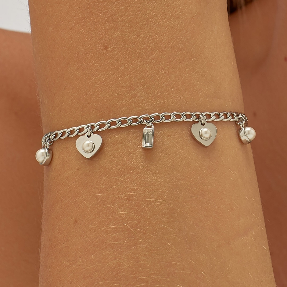 Narukvica od hirurškog čelika u beloj boji sa kristalom i biserom u prozirnoj boji. Elegantan detalj koji savršeno pristaje uz svaki outfit.