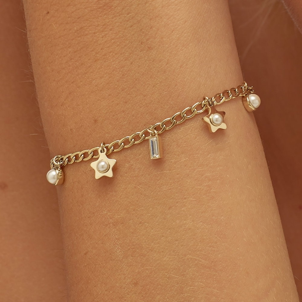 Narukvica od hirurškog čelika u žutoj boji sa kristalom i biserom u prozirnoj boji. Prelep i sofisticiran komad nakita za svaku priliku.