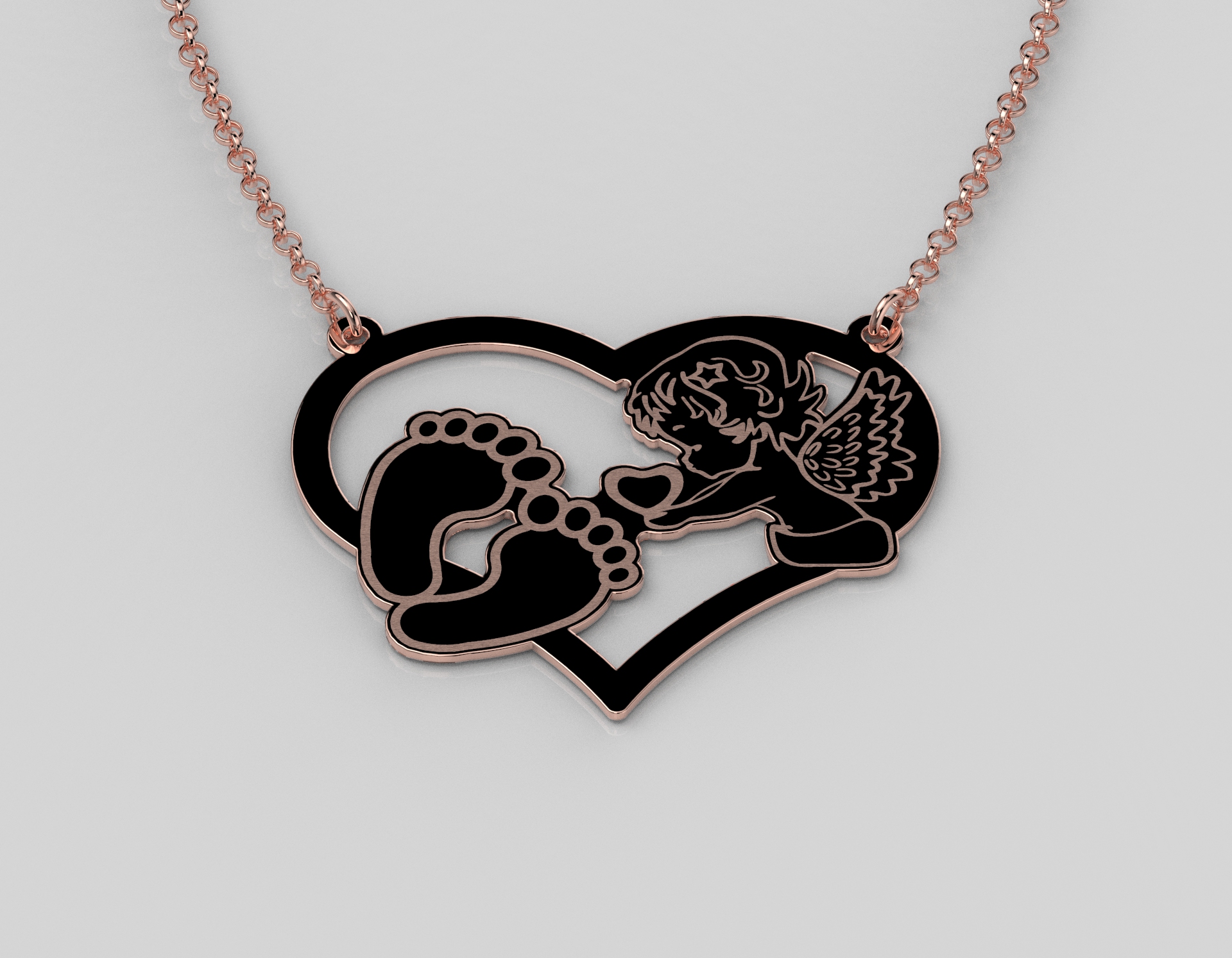 Ova prelepa ogrlica u obliku srca sa motivom anđela i sitnih stopala simbolizuje nežnost, zaštitu i ljubav. Savršena je za one koji žele da nose blagi podsetnik na posebne trenutke ili voljene osobe. Izrađena od žutog, belog ili roze zlata, pruža sofisticiranu eleganciju i suptilan sjaj. Njeni pažljivo izrađeni detalji čine je izuzetno sentimentalnim i značajnim poklonom za razne prilike.
