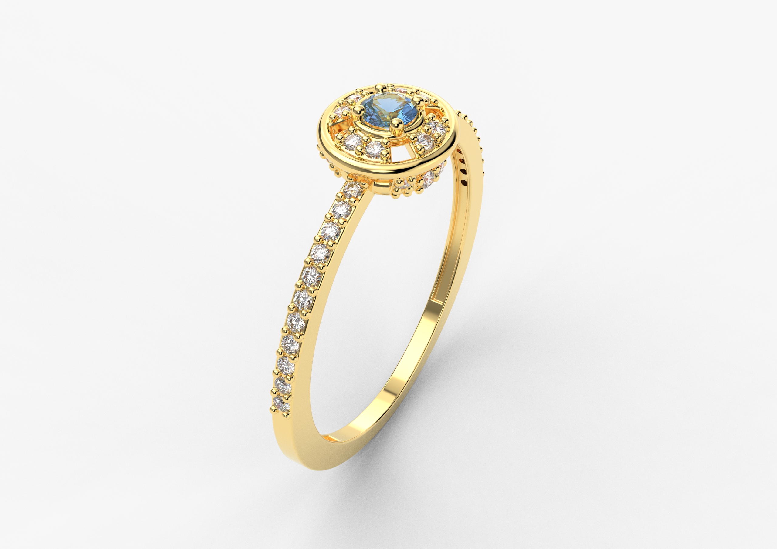 Prsten model 36 od žutog zlata sa plavim topazom i brilijantima