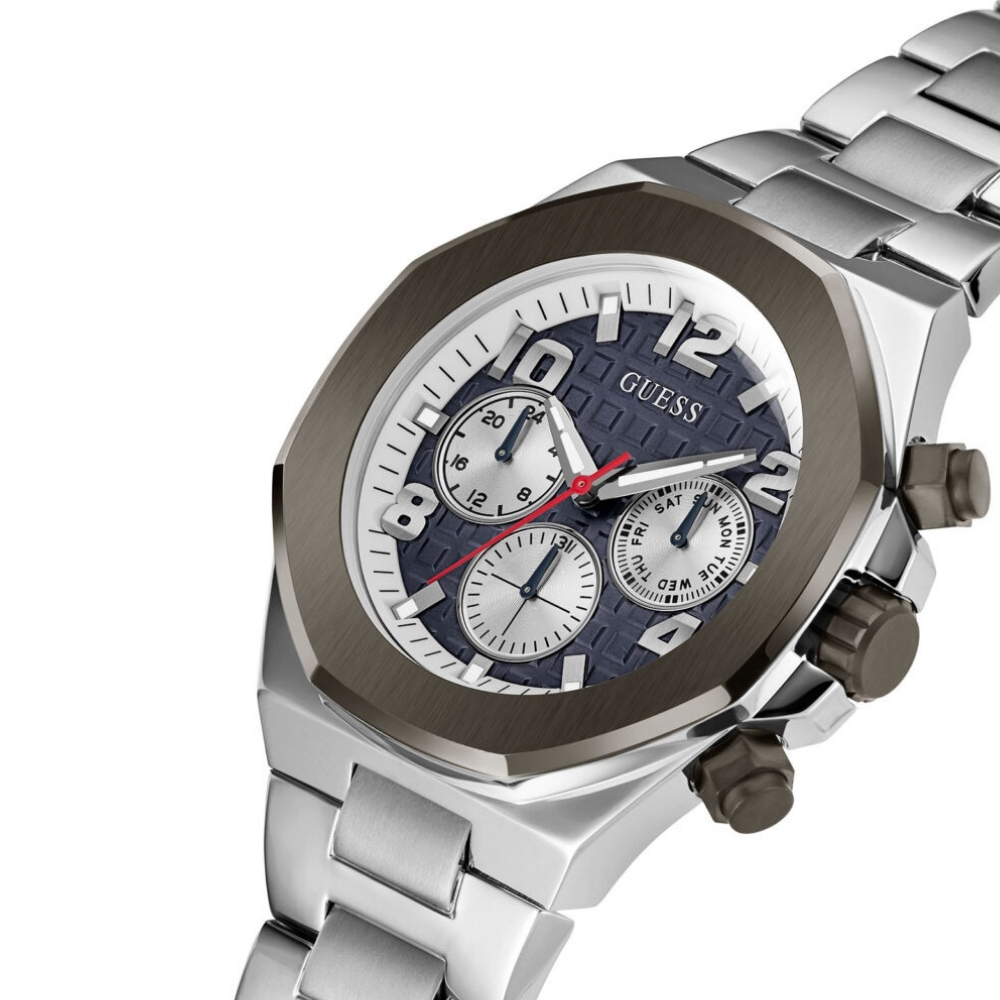 Guess muški ručni sat ima ortogonalno kućište od nerđajućeg čelika sa prečnikom od 46 mm i metalnu narukvicu. Unutar kućišta se nalazi mehanizam Seiko Instruments Inc., a sat je opremljen mineralnim staklom. Sat je vodootporan do 5 ATM