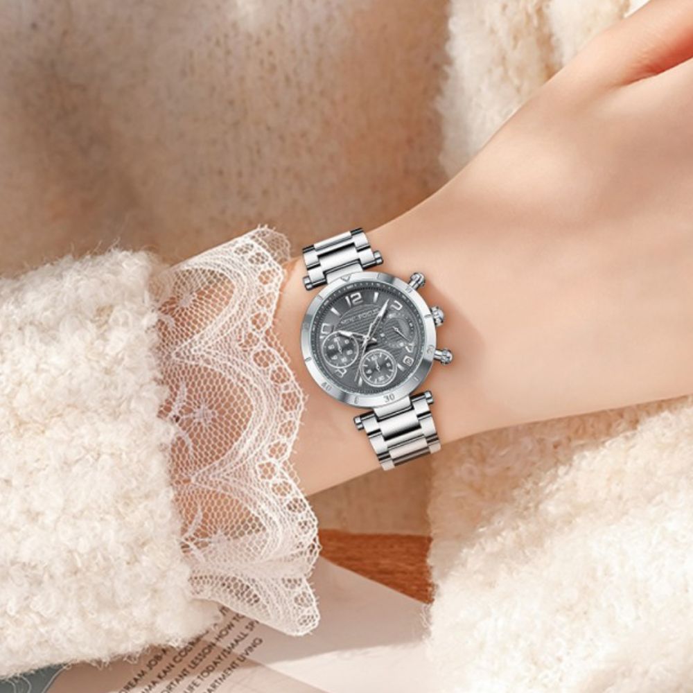 Ženski sat MF0489L.01 odiše minimalističkom elegancijom i modernim tonovima. Njegova srebrna narukvica od nerđajućeg čelika u savršenom je skladu sa sofisticiranim sivim brojčanikom, koji donosi suptilan, ali upečatljiv izgled.