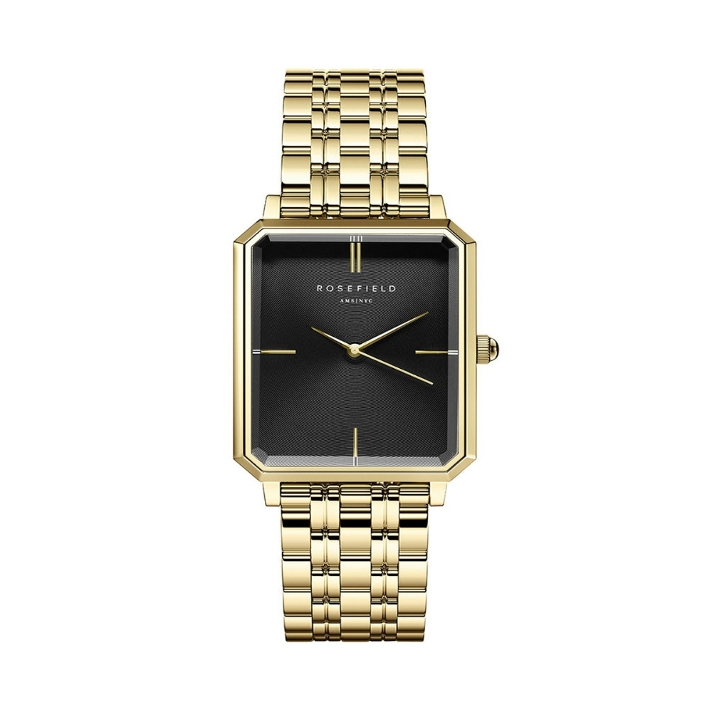 Moderan ženski ručni sat brenda Rosefield iz kolekcije The Octagon. Karakteriše ga kućište od mesinga,neobičnog je oktagonalnog oblika. Brojčanik crne boje idealno je uklopljen sa narukvicom izrađenom od nerđajućeg čelika u boji zlata. Savršen izbor za damu koja prati modne trendove.